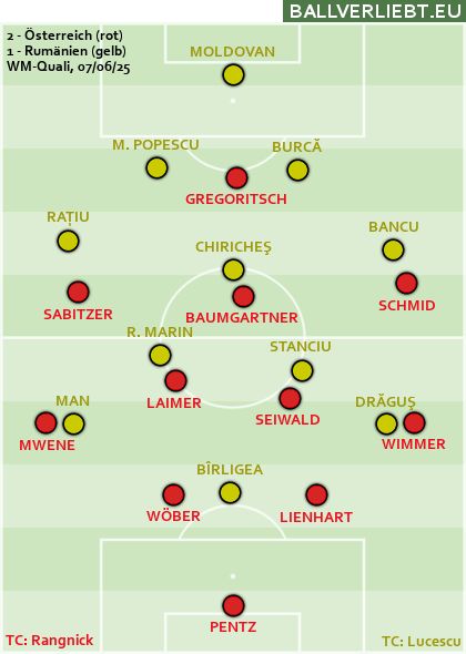 Die von ihrem Trainer-Routinier Mircea Lucescu (79) im 4-1-4-1 aufgestellten Rumänen spiegelten das österreichische System und sie achteten darauf, immer sofort sehr eng am jeweils ballführenden bzw. passempfangenden Österreicher dran zu sein, diesen in den Zweikampf zu verwickeln. Die Folge war eine wahnsinnig hektische, wilde und zerfahrende Anfangsphase.