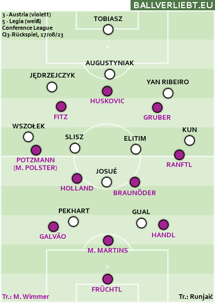 Beim Rückspiel aber machte die Austria den Gegner mit billigen Ballverlusten stark. Es dauerte zwar bis kurz vor der Halbzeit, bis Legia (endlich) in Führung ging, dass die Gäste noch vor der Pause das 2:0 nachlegten, entsprach aber den Spielanteilen und mit dem 3:0 nach einer Stunde schien das Aus der Austria schon fest auf Schiene zu sein. Der Anschlusstreffer von Andreas Gruber setzte aber neue Lebensgeister frei, in der 83. Minute erzielte wiederum Gruber das 2:3 – damit wäre es in die Verlängerung gegangen.