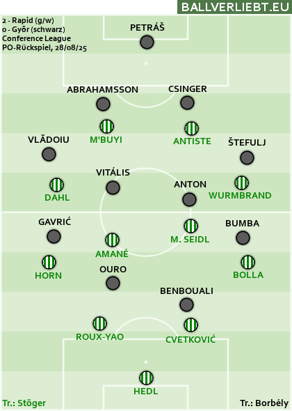Die Playoff-Hürde kam aus Győr, kein Selbstläufer, aber es hätte auch wirklich schlimmer kommen können. Das Hinspiel auf dem von einem Fungus halb zerfressenen Acker der Ungarn plätscherte vor sich hin, bis die Ungarn gleich nach Ankick zur zweiten Hälfte in Führung gingen. Rapid mühte sich gegen die eh nicht sonderlich sattelfesten Hausherren, traf im Angriffsdrittel aber viele falsche Entscheidungen. Wurmbrand hatte relativ rasch ausgeglichen, aber so richtig zwingend wurde Rapid danach nicht und dann ließ Amané seinem Gegenspieler Gavrić viel zu viel Platz, so erzielte Győr per Weitschuss das 2:1.