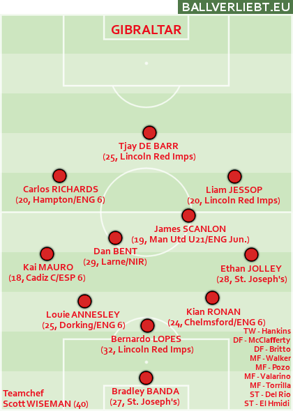 Mit gleich vielen Punkten – nämlich null – wie Liechtenstein und San Marino steht Gibraltar da, immerhin gelangen aber vier Tore. Drei Stammkräfte spielen beim nationalen Liga-Primus Lincoln und damit in der Conference League im Europacup, der Rest bewegt sich überwiegend im Regional- oder Jugendfußball. In EM-und WM-Qualifikationen wartet die Truppe vom Affenfelsen auch nach dem sechsten Anlauf noch auf einen Punktgewinn.