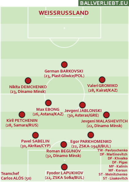 Seit Weißrussland ob der kriegsbedigten Sperre von echten Heimspielen letztes Jahr im westungarischen Zalaegerszeg eine neue Heimat gefunden hat, verlor die Truppe dort nur zwei ihrer sechs Pflichtspiele – gegen Schottland und Dänemark. Dennoch war natürlich in der WM-Quali-Gruppe nicht viel zu machen, außer die Dänen mit dem 2:2 in Kopenhagen ordentlich in Troubles zu bringen. Viele Spieler haben sich etwa in die bulgarische oder die kasachische Liga begeben, zumeist steht die Defensive ganz gut. An einem schlechten Tag ist aber stets auch ein kräftiges Debakel drin.