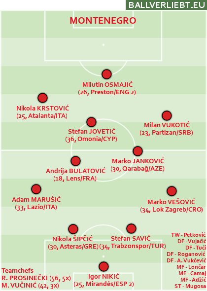 Wie Kasachstan war auch der kleinste Nachfolge-Staat von Jugoslawien vor zwei Jahren drauf und dran, ein EM-Ticket zu holen, und zwar auf Kosten von Serbien. Nun gab es die harte Landung auf dem Boden der Realität, Niederlage gegen die Färöer inklusive. Statt der kroatischen Legende Robert Prosinečki brachte die montenegrinische Legende Mirko Vučinić die kaputte Quali zu Ende. Erstaunlich: In den acht Spielen startete Montenegro mit fünf verschiedenen Systemen.