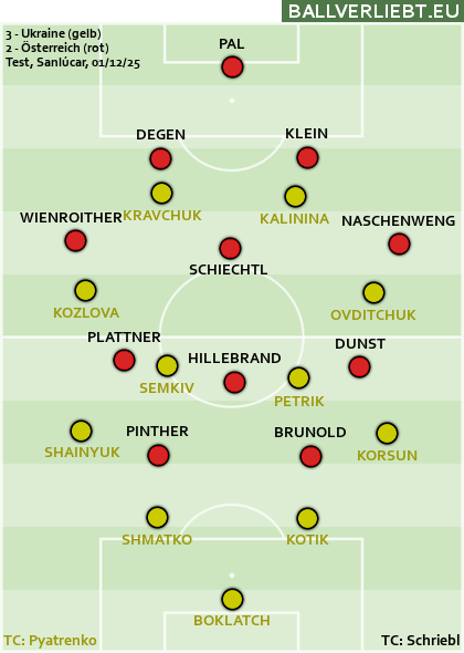 Beim ersten ukrainischen Tor lief Kozlova durch den völlig verwaisten Halbraum, beim zweiten verließen sich Klein und Degen darauf, dass die jeweils andere das Zuspiel auf Kravchuk abfängt. Klassische Abstimmungsfehler, wenn man sonst so nie zusammen spielt. Das System war gleich wie gegen Finnland (also viel mehr ein 4-1-3-2 als ein 4-3-1-2), die ukrainische IV wurde aber nicht angelaufen, der Pressingtrigger war der Pass auf die ukrainischen AV. Die Ukraine ist in seinem Wesen ein unkreatives Team, machte aber viel durch das Tempo der Außenstürmerinnen wett.