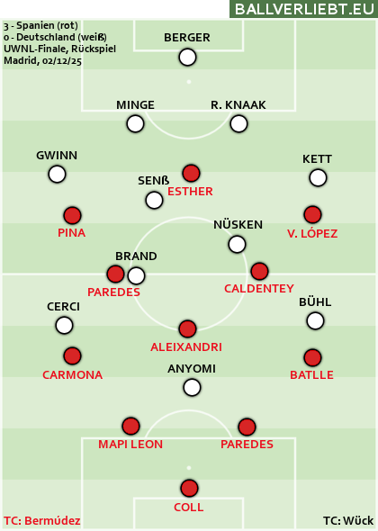 Im Rückspiel vor 55.000 spanischen Fans in Madrid sah es dann aber doch wieder so aus wie auch schon im EM-Semifinale, das Spanien für sich entscheiden hatte können: Deutschland agierte zu passiv, lud Spanien (wo Aitana Bonmatí mit einem im Training erlittenen Wadenbeinbruch lange ausfallen wird) zum kampflosen Ballbesitz ein. Eine Stunde lang blieb es beim 0:0, ehe Spanien in kürzester Zeit auf 3:0 stellte und damit auch die zweite Auflage dieses Turniers für sich entschied.