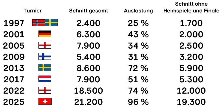 Gleichzeitig wurde der vor drei Jahren in England aufgestellte Rekord an Gesamt-Zuschauerschnitt in den Stadien (18.500) sowie der Stadion-Auslastung (74%) deutlich überboten – 21.200 Zuschauer pro Spiel bedeuteten in den acht Spielorten in der Schweiz eine Auslastung von 96 Prozent. Noch deutlicher wird es, wenn man die Matches des Gastgebers und des Finales rausrechnet, nur Spiele zwischen Gäste-Teams berücksichtigt.