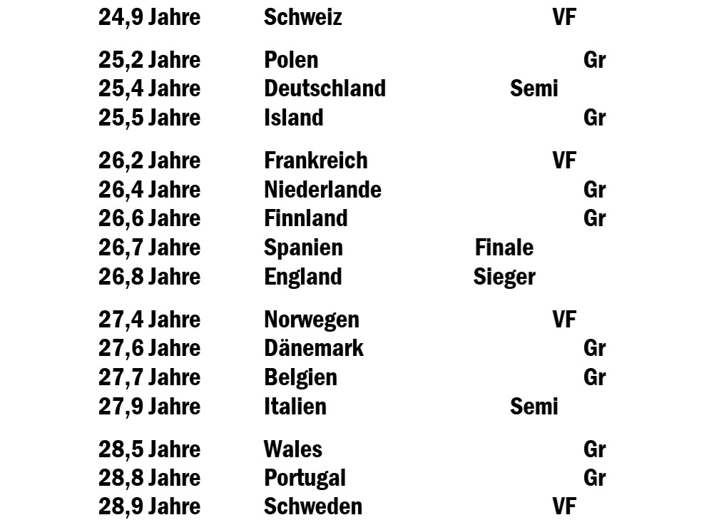 Was das an tatsächlichen Einsatzminuten errechnete Durchschnitts-Alter der 16 Teilnehmer angeht, ist am einen Ende der Skala alles beim Alten (no pun intended) – Schweden stellt wie praktisch immer die Methusalem-Truppe. Die beiden Finalisten sind schön in der Mitte angesiedelt, Deutschland stellt tatsächlich eine erstaunlich junge Mannschaft.