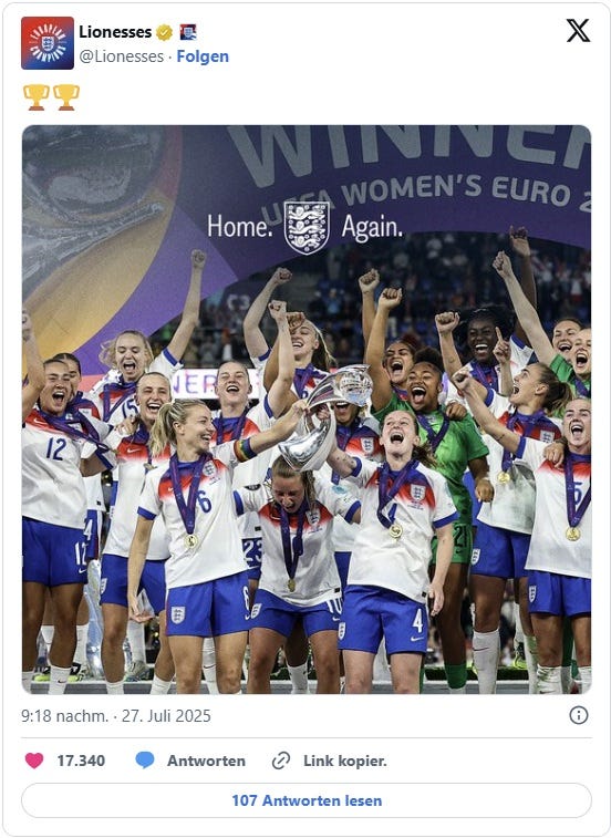Fakt ist: Mit England geht jenes Land mit dem Pokal in der Hand aus diesem Turnier hervor, das in den letzten zwölf Jahren am meisten in den Frauenfußball investiert hat, das die sportlich wie finanziell in der Breite stärkste Liga hat. Gegner war jenes Land, das de facto mit dem Team des über die letzten Jahre besten Vereinsteams Europas spielt, dieser Verein stellt seine exzellenten Strukturen schon lange auch für die Frauen ambitioniert zur Verfügung.
