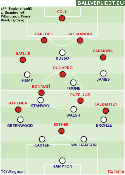 Das machte England nach dem Seitenwechsel – auch angetrieben von Chloe Kelly, die etwas früher als geplant für die angeschlagene Lauren James ins Spiel gekommen war – auch, hielt Spanien damit besser vom eigenen Tor weg und glich nach einer Stunde aus. Spanien wurde etwas kopflos, umso mehr, als sich Teamchefin Montse Tomé in die Auswechslung von Putellas für Flügelstürmerin Pina hineintheatern hat lassen. Weil die nominell auf die Acht geschobene Caldentey weit vorne verblieb, entstand ein zu großes Loch im Mittelfeld, als dass Guijarro und Bonmatí es mit ihrem Kurzpassspiel kontrollieren hätten können.