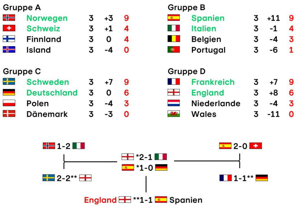 Statistisch fällt neben der erwähnten Elfmeter-Schwäche natürlich der Schnitt von 3,4 Toren pro Spiel auf, was deutlich mehr ist als bei der letzten Frauen-EM (3,1) und auch bei der Männer-EM (2,3) – obwohl nur ein Team wirklich deutlich abgefallen ist (Wales mit 2:13 Toren) und die Anzahl der übrigen Kantersiege überschaubar war. Nur drei der anderen Matches endeten mir mehr als zwei Toren Differenz, bei der Männer-EM letztes Jahr waren es insgesamt sechs.