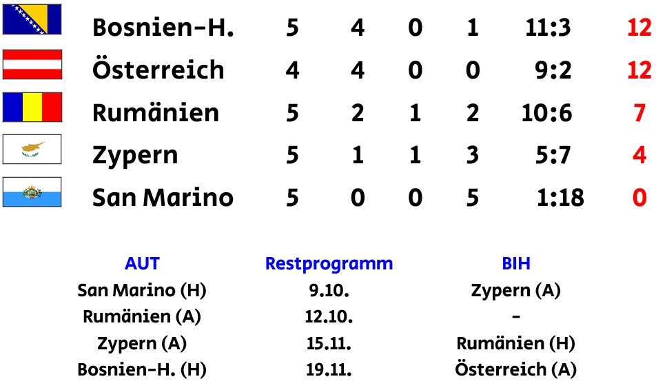 Das ÖFB-Team gewann dabei 1:0 in Linz gegen Zypern und 2:1 in Zenica gegen Bosnien-Herzegowina, brachte sich damit in eine sehr gute Position im Rennen um den Gruppensieg und damit das direkte Ticket für die WM-Endrunde im kommenden Jahr.