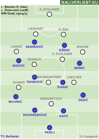 Weil aber auch die restlichen Bosnier sehr schnell und sehr robust in Ballnähe waren und keinen Zweikampf scheuten, tat sich Österreich schwer im Aufbau und weil die Bosnier sehr rasch sehr vertikal spielten – ohne dabei aber viele blinde Pässe zu produzieren – entzogen sie sich auch dem österreichischen Pressing. Das Resultat war ein extrem intensives, sehr zweikampfbetontes Match.
